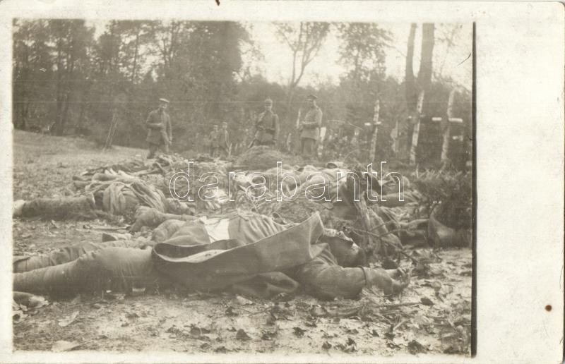 Első világháborús osztrák-magyar halott katonák az előre elkészített keresztfákkal / WWI K.u.K. military, dead soldiers with the pre-made wooden crosses, photo
