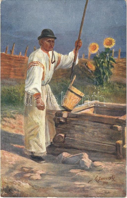 Pöstyén, Pistyan, Piestany; Pöstyén-fürdői népviselet, paraszt a kútnál. 18. Pr. 3. sz. / Volkstracht in Bad Pöstyén, Beim Brunnen / Upper Hungarian folklore, traditional costume s: Janovsky (EK)