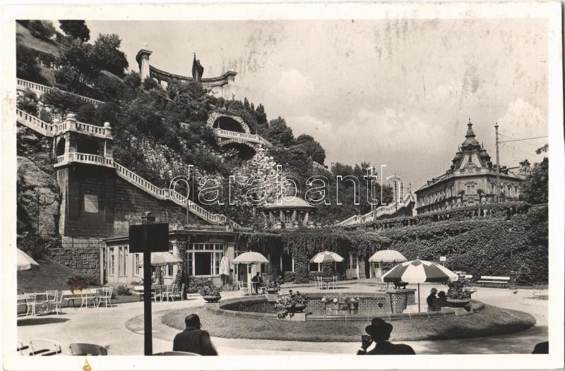 Beschreibung: 1936 Budapest I. Szent Gellért szobor, Gellérthegyi feljárat, Hungária és Attila gyógyforrások a Döbrentei térnél, Gellért Udvar (fl)