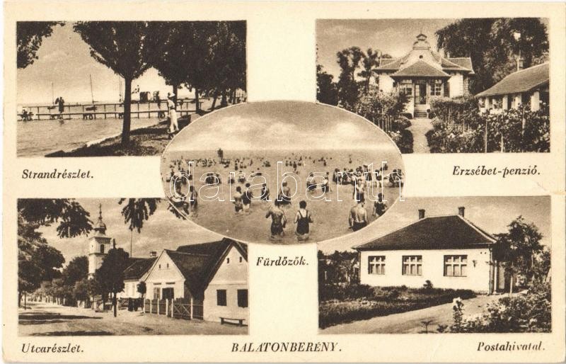 Balatonberény, Strand, fürdőzők, Erzsébet penzió, utca, templom, Posta... https://www.darabanth.com/de/365-Fernauktion/365.0/Ansichtskarten/Ungarn~1500004/Balatonbereny-Strand-furdozok-Erzsebet-penzio-utca-templom-Postahivatal-szakadas-tea~II2109940