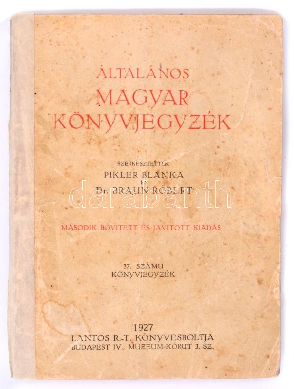 Általános magyar könyvjegyzék. Szerk.: Pikler Blanka, Dr. Braun Róbert. Második bővített és javított kiadás. Bp., 1927. Lantos R.-T. Könyvesboltja. Kiadói papírkötés javított gerinccel.