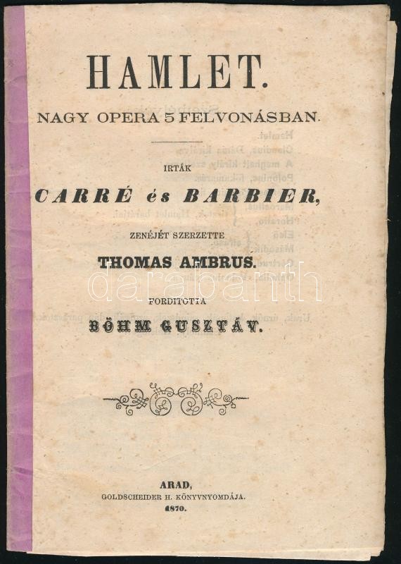 Carré-Barbier: Hamlet. Zenéjét szerezte: Thomas Ambrus. Ford. Böhm Gus... https://www.darabanth.com/de/365-Fernauktion/365.0/Bucher/Bucher-Andere-kuriositaten~1000022/Carre-Barbier-Hamlet-Zenejet-szerezte-Thomas-Ambrus-Ford-Bohm-Gusztav-Arad-1870-Goldsch~II2112391