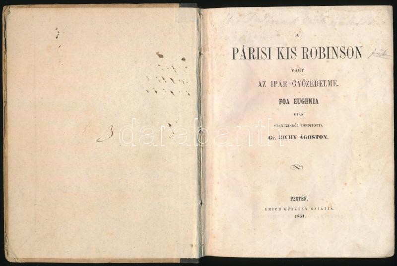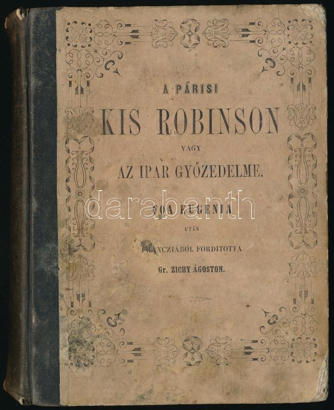 Foa Eugenia: A párisi kis Robinson vagy az ipar győzelme. Ford.: Zichy Ágoston. Pest, 1851., Emich Gusztáv, 238 p.+1 t. (Pest, Tyroler J. színezett acélmetszet.) Kiadói kopott félvászon-kötésben, ajándékozási sorokkal, 3 tábla hiányzik.
