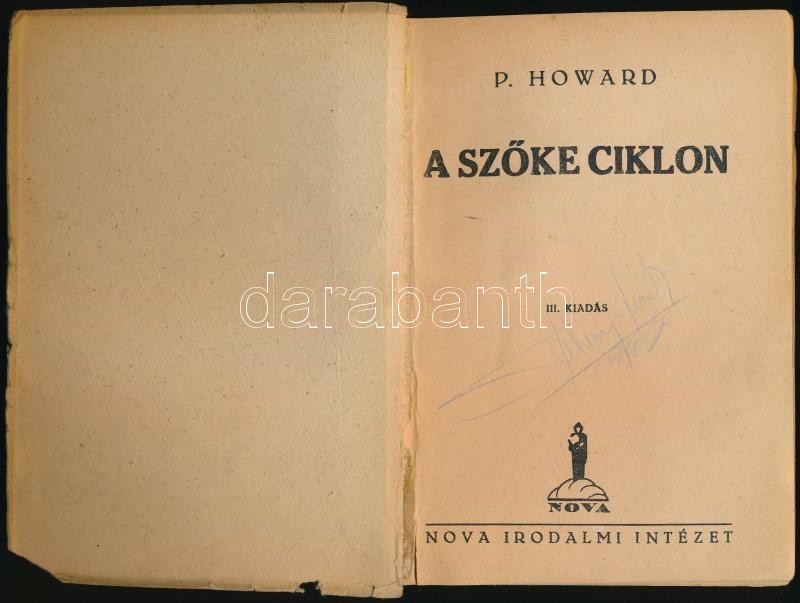 [Rejtő Jenő] P. Howard: A szőke ciklon. Nova Kalandos Regényei. Bp.,(1947), Nova, 160 p. 3. kiadás. A borító Pályi Jenő munkája. Kiadói papírkötés, kijáró lapokkal, kissé szakadozott borítóval.