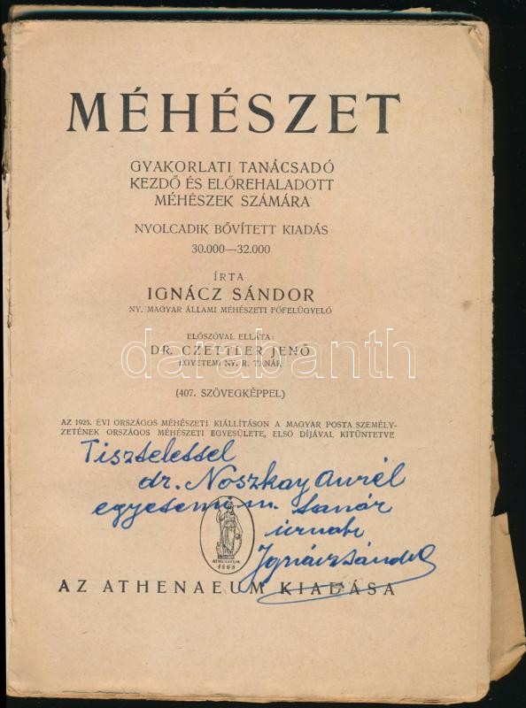 Ignácz Sándor: Méhészet. Gyakorlati tanácsadó kezdő és előrehaladott méhészek számára. Bp.,[1948.], Athenaeum. Nyolcadik kiadás. Fekete-fehér fotókkal, ábrákkal. Borító nélküli példány, rossz, széteső, hiányos (108-387. oldalak között) állapotban. A szerző által, dr. Noszkay Aurél (1900-1987) orvos, egyetemi tanár részére dedikált.