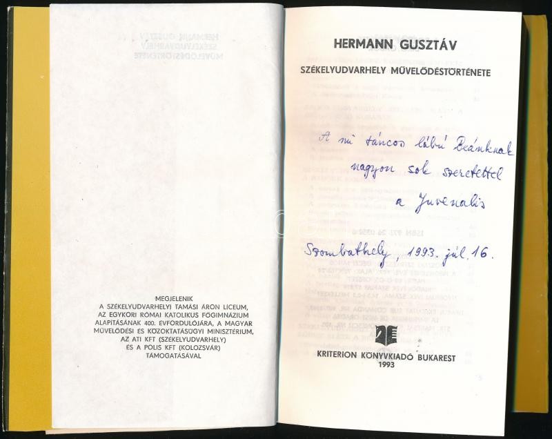 Hermann Gusztáv: Székelyudvarhely művelődéstörténete. Bukarest, 1993, ... https://www.darabanth.com/de/365-Fernauktion/365.0/Bucher/Bucher-Reise-und-Ortgeschichte~1000001/Hermann-Gusztav-Szekelyudvarhely-muvelodestortenete-Bukarest-1993-Kriterion-Kiadoi-papC3~II2112384