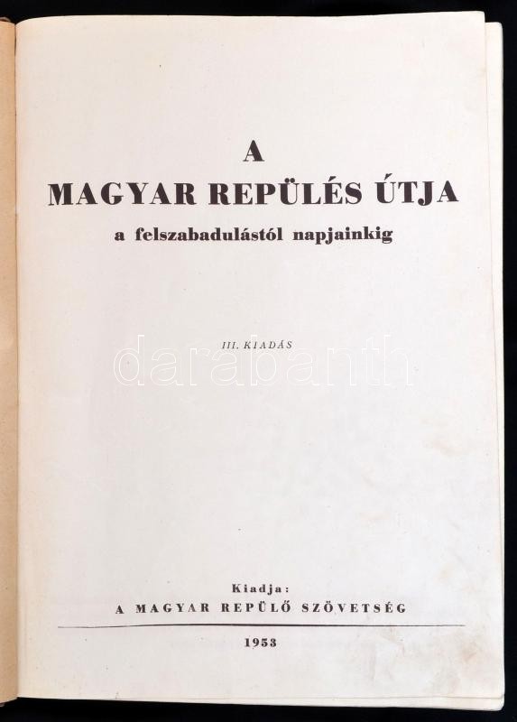 A magyar repülés útja a felszabadulástól napjainkig. Bp.,1953, Magyar Repülő Szövetség, 200+4 p. III. kiadás. Félvászon-kötésben, kopott borítóval. Megjelent 3000 példányban.