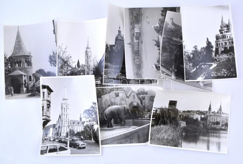 Beschreibung: cca 1960-1970 9 db Budapesti fotó, Mátyás templom, panoráma Parlamenttel, Állatkert elefánttal..stb, 18x24 cm.