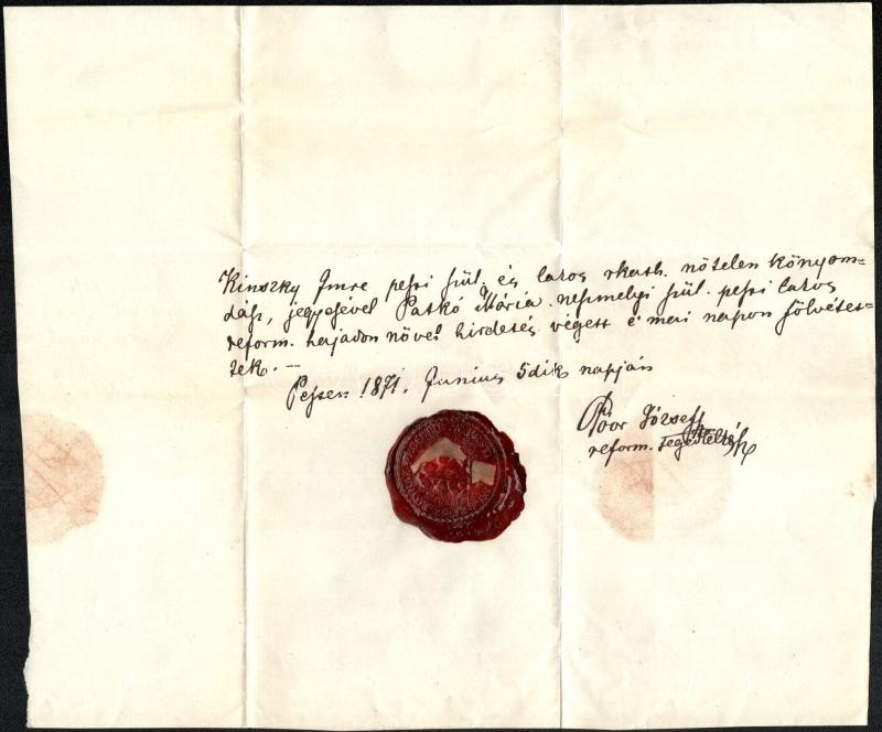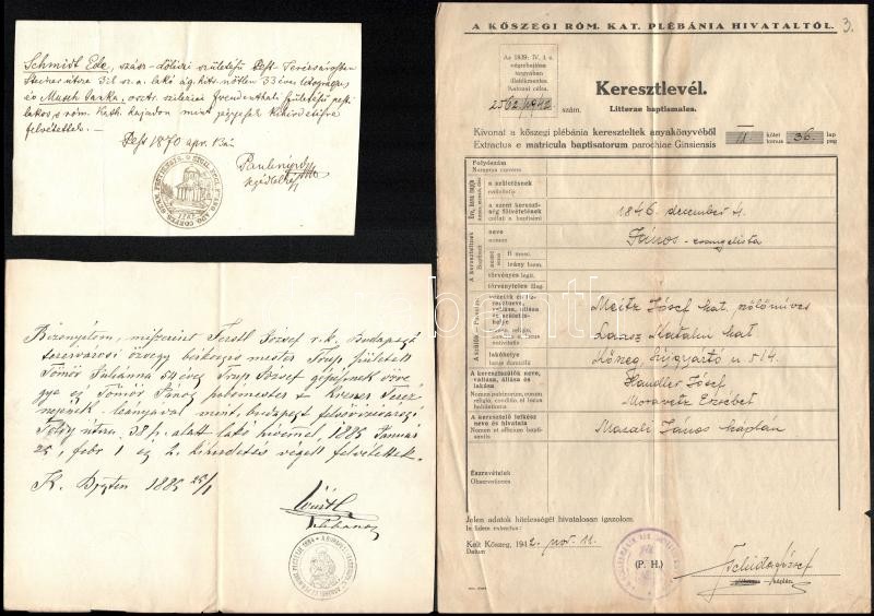 1870-1942 4 db pesti és kőszegi egyházi irat, közte keresztlevél, egyi... https://www.darabanth.com/de/365-Fernauktion/365.0/Kunst-Dokumente-andere-Sammelgebiete/Dokument~500018/1870-1942-4-db-pesti-es-koszegi-egyhazi-irat-kozte-keresztlevel-egyik-pecsettel-jelzett~II2090995