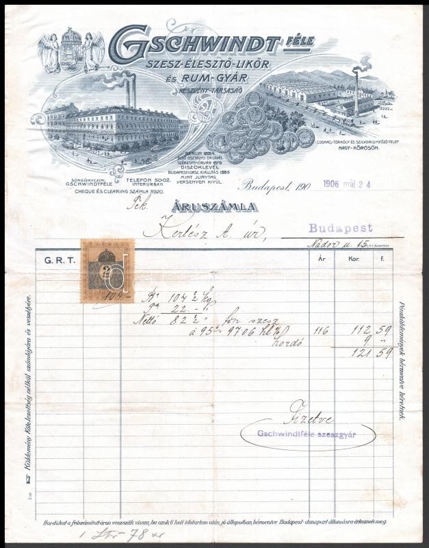 1906 Bp., A Gschwindt-féle Szesz-Élesztő-Likőr és Rum-Gyár dekoratív s... https://www.darabanth.com/de/365-Fernauktion/365.0/Kunst-Dokumente-andere-Sammelgebiete/Dokument~500018/1906-Bp-A-Gschwindt-fele-Szesz-Eleszto-Likor-es-Rum-Gyar-dekorativ-szamlaja-rajta-a-gya~II2113366