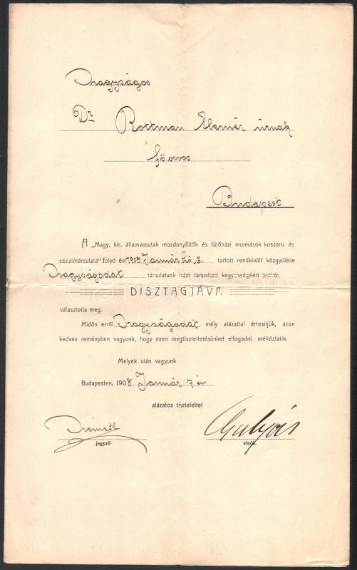 Beschreibung: 1908 MÁV mozdonyfűtők ls fűtőházi munkások koszorú- és zászlótársulata dísztaggá választó okmánya Dr. Rottman Elemér főorvosnak, aláírásokkal