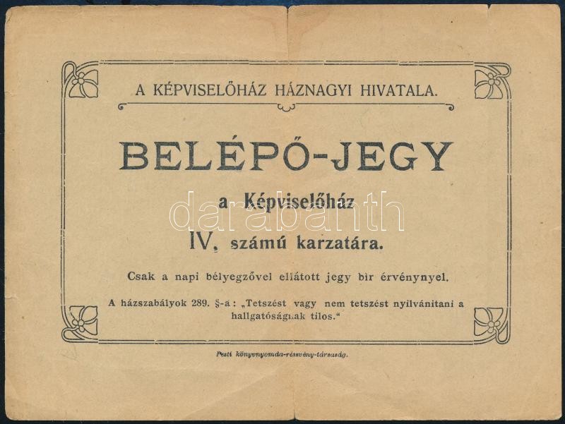 1910 Képviselőház Háznagyi Hivatalának belépőjegye a Képviselőház IV. ... https://www.darabanth.com/de/365-Fernauktion/365.0/Kunst-Dokumente-andere-Sammelgebiete/Dokument~500018/1910-Kepviselohaz-Haznagyi-Hivatalanak-belepojegye-a-Kepviselohaz-IV-szamu-karzatara-~II2112698