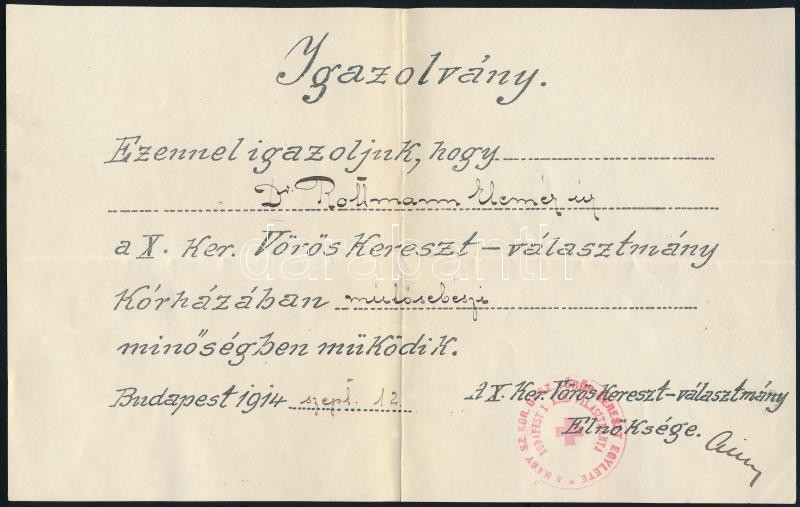 1914 Magyar Vöröskereszt műtősebészi igazolványa, pecséttel, 13x21 cm https://www.darabanth.com/de/365-Fernauktion/365.0/Kunst-Dokumente-andere-Sammelgebiete/Dokument~500018/1914-Magyar-Voroskereszt-mutosebeszi-igazolvanya-pecsettel-13x21-cm~II2109635