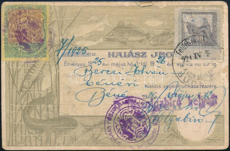 1925 Halászjegy inflációs okmánybélyeg kiegészítéssel https://www.darabanth.com/de/365-Fernauktion/365.0/Kunst-Dokumente-andere-Sammelgebiete/Dokument~500018/1925-Halaszjegy-inflacios-okmanybelyeg-kiegeszitessel~II2112641