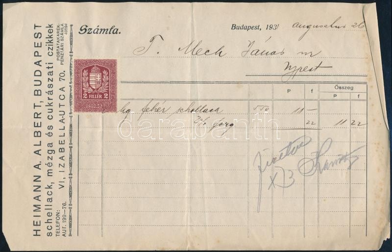 1931 Heimann A. Albert schellack, mézga és cukrászati cikkek gyára fej... https://www.darabanth.com/de/365-Fernauktion/365.0/Kunst-Dokumente-andere-Sammelgebiete/Dokument~500018/1931-Heimann-A-Albert-schellack-mezga-es-cukraszati-cikkek-gyara-fejleces-szamla-okmanybe~II2109432