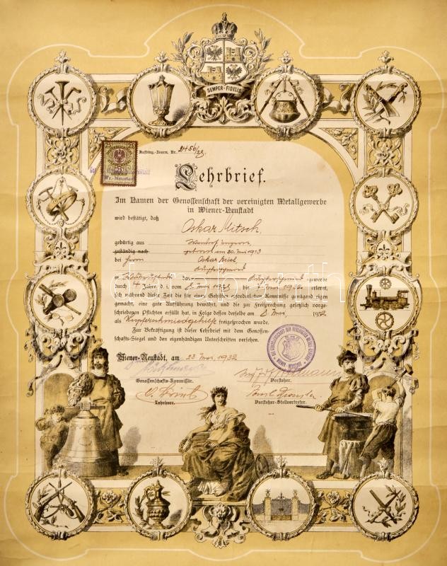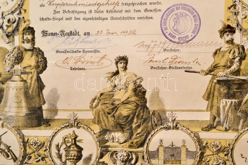 Beschreibung: 1932 Bécsújhelyi Egyesített Fémipari Szövetkezet díszes rézműves segédi oklevele, okmánybélyeggel, aláírásokkal, pecséttel, német nyelven.