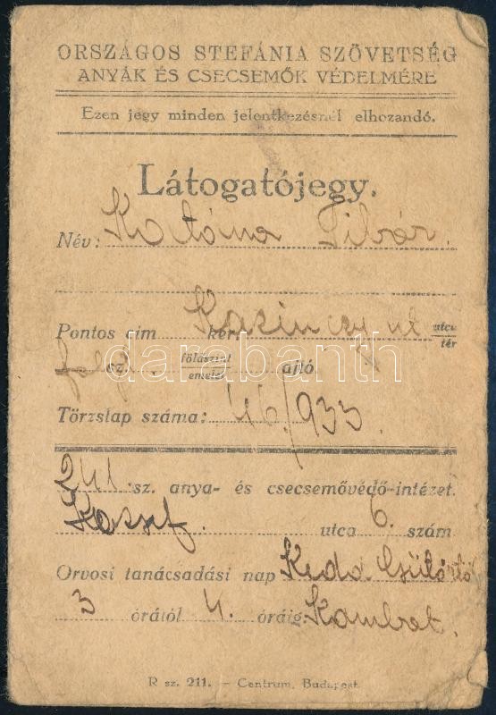 1933 Országos Stefánia Szövetség 241.sz anya- és csecsemővédő-intézet ... https://www.darabanth.com/de/365-Fernauktion/365.0/Kunst-Dokumente-andere-Sammelgebiete/Dokument~500018/1933-Orszagos-Stefania-Szovetseg-241sz-anya-es-csecsemovedo-intezet-latogatojegyeigazo~II2109504