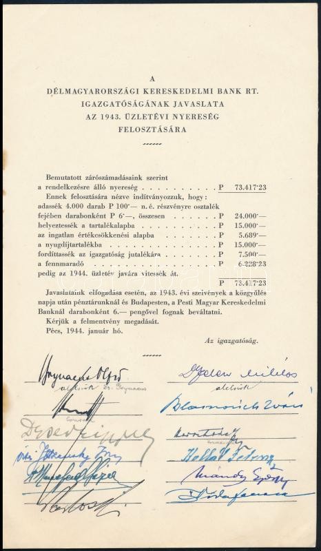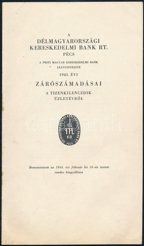 1944 A Délmagyarországi Kereskedelmi Bank Rt. 1943. évi zárszámadásai,... https://www.darabanth.com/de/365-Fernauktion/365.0/Kunst-Dokumente-andere-Sammelgebiete/Dokument~500018/1944-A-Delmagyarorszagi-Kereskedelmi-Bank-Rt-1943-evi-zarszamadasai-alairasokkal~II2110273