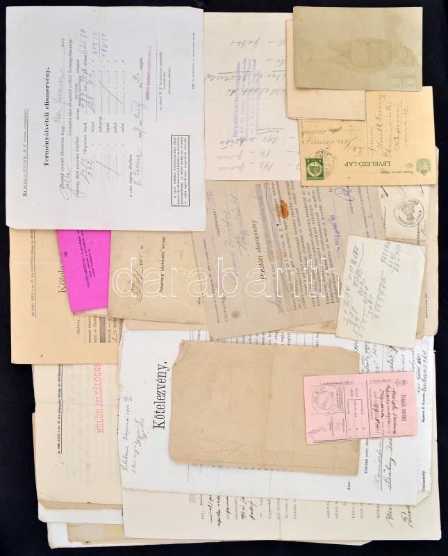 cca 1889-1929 Vegyes papírrégiség tétel, db: Kötelezvények, adásvételi és ajándékozási szerződések, okmánybélyegekkel, 60 kr. (2x), 3 kr. (2x), 3 kr., 15 kr., 4 kr., 2 K, 80 f (4x), 1 K 26 f., Gölléről és Kaposvárról, valamint 1 db katona fotó is, nyugták, göllei Kamatozó Kötelezvénykölcsönök könyvecskéje, ..stb. Változó állapotban.