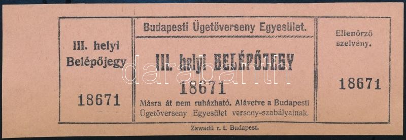 Beschreibung: cca 1910 III. helyi belépőjegy ellenőrző szelvénnyel a budapesti ügetőversenyre, szép állapotban