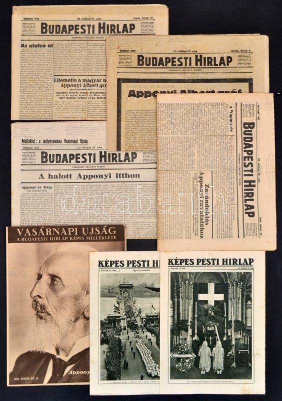 1933 Újság és cikk gyűjtemény Apponyi Albert (1846-1933) halálhíreivel, ravatalával és temetésével: