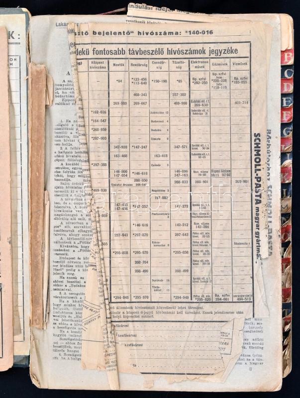 1943 Budapesti Egységes Hálózat betűrendes távbeszélő névsora. Telefonkönyv. Két lap kijár, sérült, hiányos, a papírborító elülső táblája leszakadt, a külső vászontok sérült, szétszakadt, rossz állapotban.
