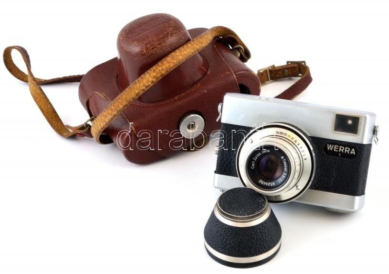 cca 1955 Carl Zeiss Werra 1 kisfilmes fényképezőgép, Tessar 50mm f/2.8 objektívvel, erdeti bőr tokjával, működőképes, jó állapotban / Vintage German film camera, in good condition, with original case
