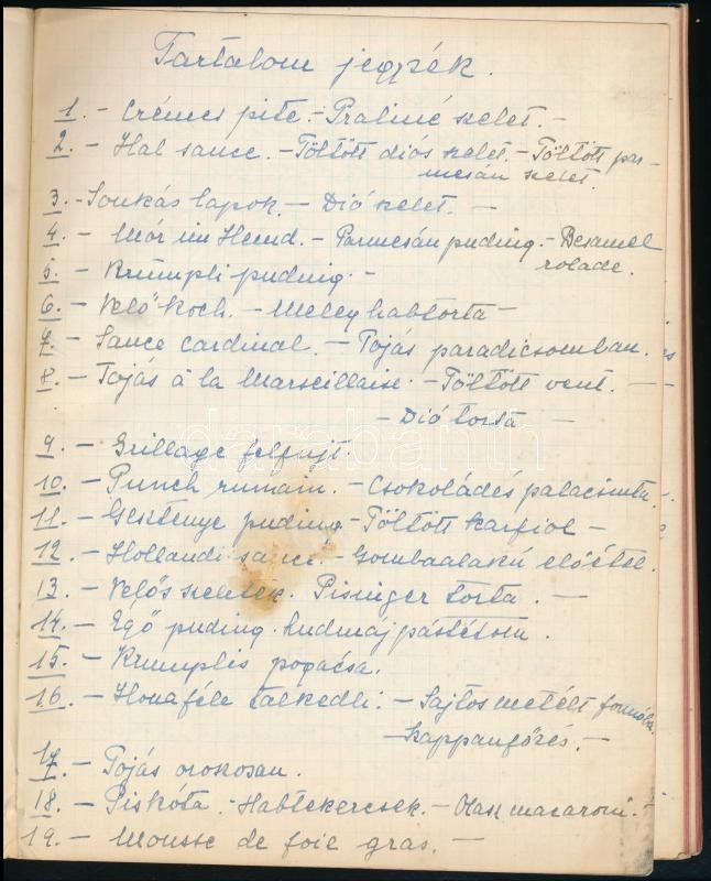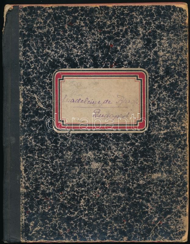 1919 "Madeleine de Baross": Szakácskönyv 919", kézzel írt szakácskönyv, "Madeleine de Baross" névvel a borítón, kopott félvászon-kötésben, kis sérüléssel a gerincen, 141+9 p.