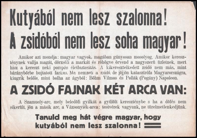 cca 1939 "Kutyából nem lesz szalonna! A zsidóból nem lesz soha magyar!... https://www.darabanth.com/de/365-Fernauktion/365.0/Kunst-Dokumente-andere-Sammelgebiete/Judaica~500023/cca-1939-Kutyabol-nem-lesz-szalonna-A-zsidobol-nem-lesz-soha-magyar-zsidoellenes-plakat-~II2112457