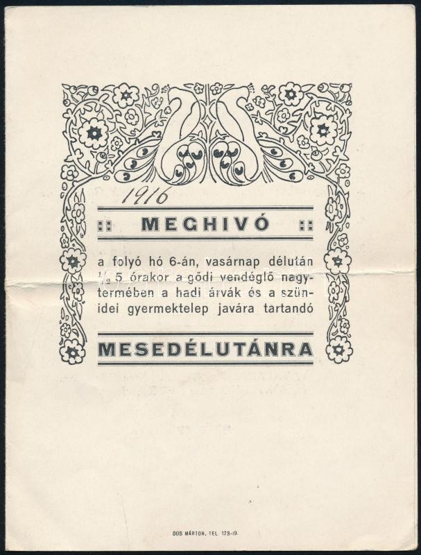 Beschreibung: 1916 Göd, Meghívó mesedélutánra hadi árvák és szünidei gyermektelep javára, hajtásnyommal.