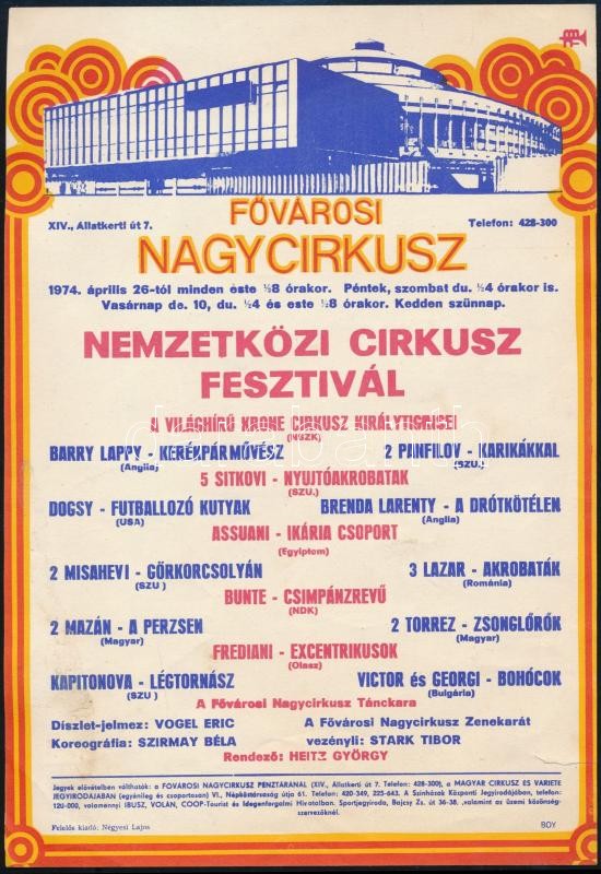 1974 Fővárosi Nagycirkusz Nemzetközi Cirkusz Fesztivál villamosplakátj... https://www.darabanth.com/de/365-Fernauktion/365.0/Kunst-Dokumente-andere-Sammelgebiete/Plakat~2000022/1974-Fovarosi-Nagycirkusz-Nemzetkozi-Cirkusz-Fesztival-villamosplakatja-Bp-Magyar-Hirdeto-~II2109877