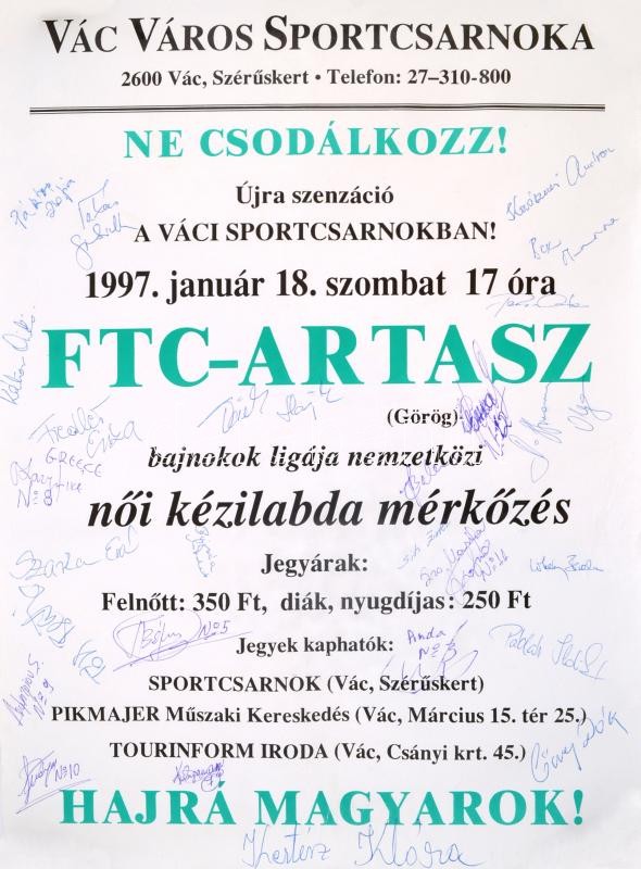 1997 FTC-Artas női kézilabda Bajnokok Ligája mérkőzés plakátja, a két csapat tagjainak aláírásával. Kökény Beáta, Pádár Ildikó, Lőwy Dóra, Kántor A, Pásztor Zs. stb. 2000-ben olimpiai ezüstérmesek, szakadással, 47×34 cm