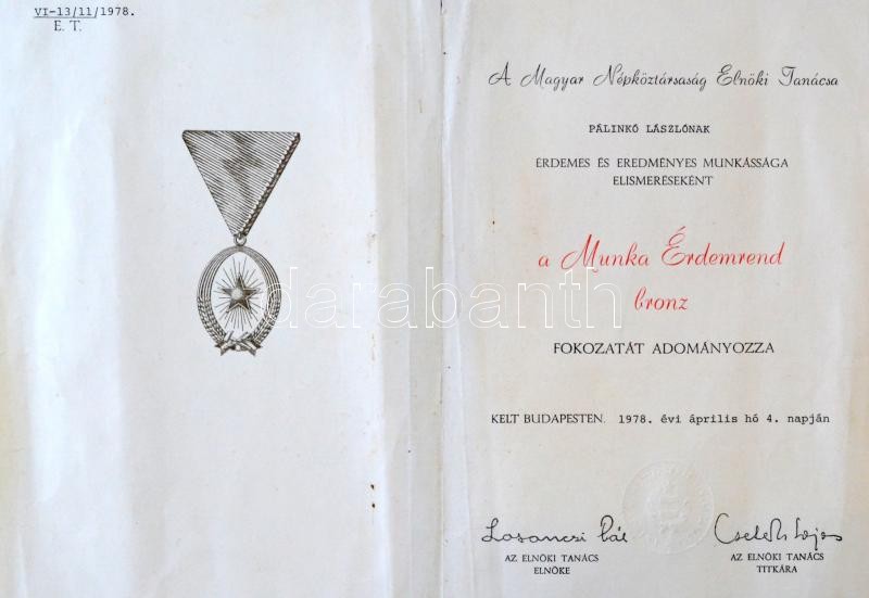1985. "Munka Érdemrend" bronz fokozata Br zománcozott kitüntetés mellszalaggal, miniatűrrel dísztokban, nem hozzá tartozó 1978-as adományozói okirattal T:1-
