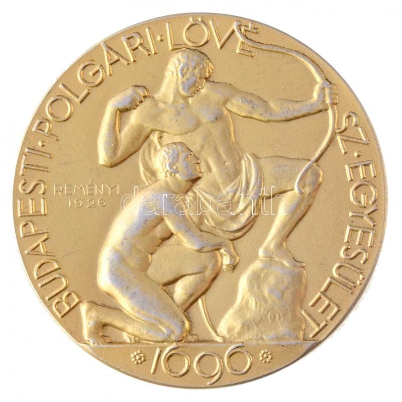 Reményi József (1887-1977) 1926. "Budapesti Polgári Lövész Egyesület / Hazádat és királyodat védeni tanuld itt" jelzett, aranyozott Ag díjérem peremen "JC (Johann Christelbauer)" gyártói jelzéssel (40,42g/0.900/45,5mm) T:1-,2 kis ph.