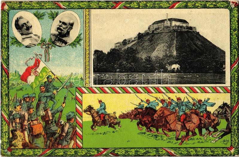 Munkács, Mukacheve, Mukachevo, Mukacevo; vár. Magyar hazafias katonai propaganda montázs Ferenc Józseffel és II. Vilmos császárral. Viribus Unitis / castle. Hungarian patriotic military propaganda montage with Franz Joseph and Wilhelm II. Viribus Unitis litho