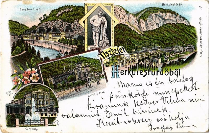 Beschreibung: 1903 Herkulesfürdő, Baile Herculane; Szapáry fürdő, Rezső udvar, gyógyterem / spa. Jáger Emil Art Nouveau, floral, litho (EK)