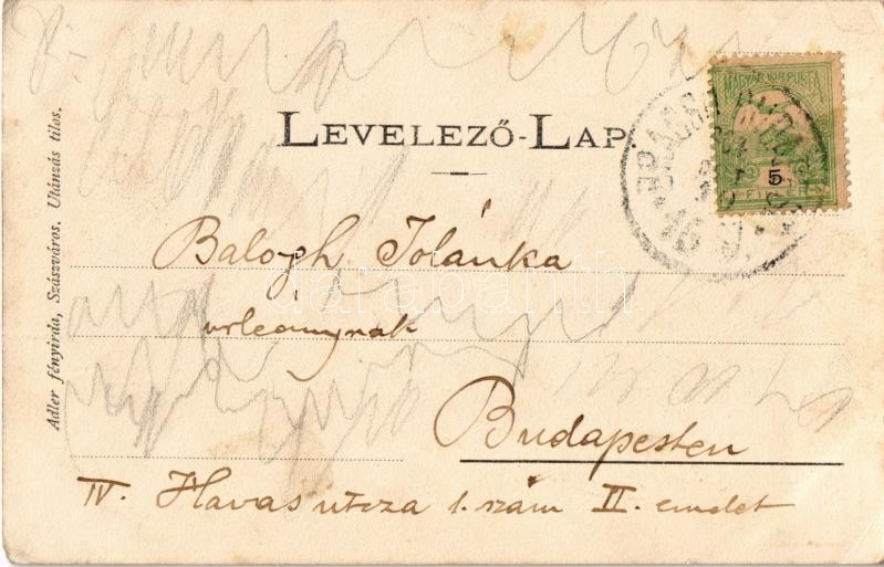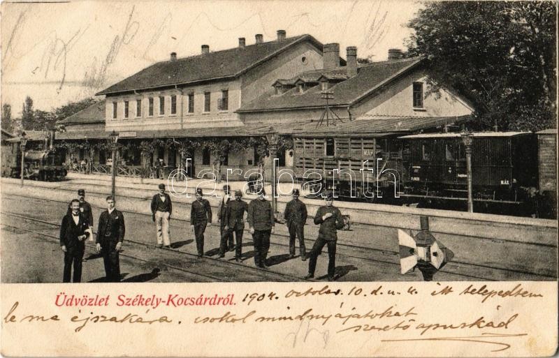 1904 Székelykocsárd, Kocsárd, Lunca Muresului; Vasútállomás, gőzmozdony, vonat, tehervagonok, vasutasok. Adler fényirda kiadása / Bahnhof / railway station, train, locomotive, freight wagons, railwaymen + "BRASSÓ - BUDAPEST 16. SZ." vasúti mozgóposta bélyegző (kopott sarok / worn corner)