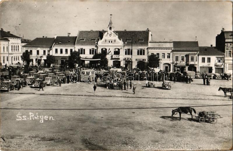1940 Szászrégen, Reghin; Fő tér, bevonulás, automobilok, Hügel, Jacob J., Heinrich Graef és Carl Kasper üzlete / main square, entry of the Hungarian troops, automobiles, shops. photo + "1940 Szászrégen visszatért" So. Stpl
