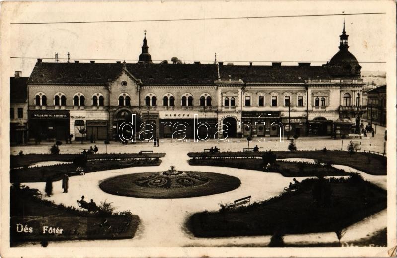 Dés, Dej; Fő tér, Szigyártó Sámuel, Móritz Ernő, Szentkirályi Jenő, Salamon Jakab, Gersner Ödön, Bíró, Wolf és Heinovits Ferenc üzlete, Hangya, gyógyszertár / main square, shops, pharmacy (EK)