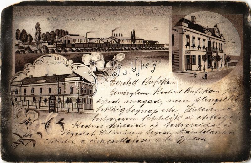 Beschreibung: 1900 Sátoraljaújhely, M. kir. államvasutak gyártelepe, gőzmozdony, városház, M. kir. dohánygyár. Lövy Adolf kiadása, floral, Art Nouveau, litho (EM)