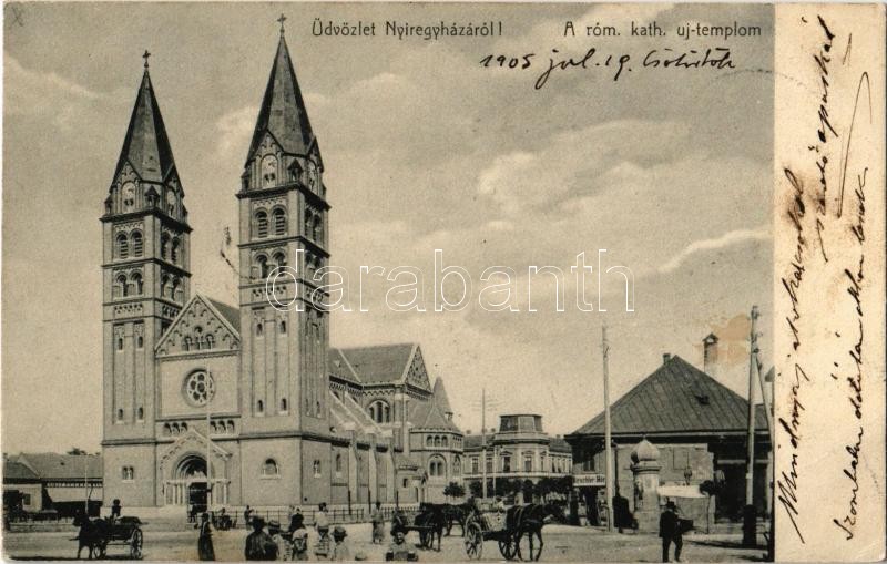 1905 Nyíregyháza, Római katolikus új templom, Guttmann Henrik, Hirschler Mór üzlete. Piringer János kiadása + "M. SZIGET - MISKOLCZ - BUDAPEST 33" vasúti mozgóposta bélyegző