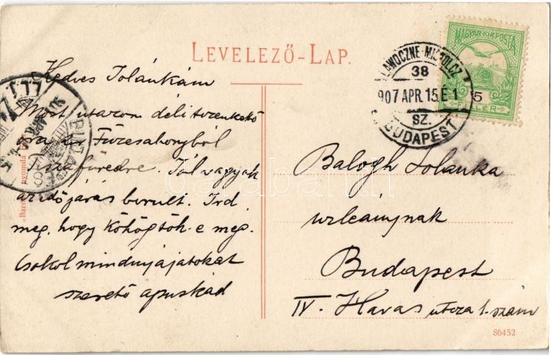 Beschreibung: 1907 Füzesabony, Fogyasztási és Értékesítő Szövetkezet üzlete. "Baross" nyomda kiadása + "LAWOCZNE - MISKOLCZ - BUDAPEST 38. SZ." vasúti mozgóposta bélyegző
