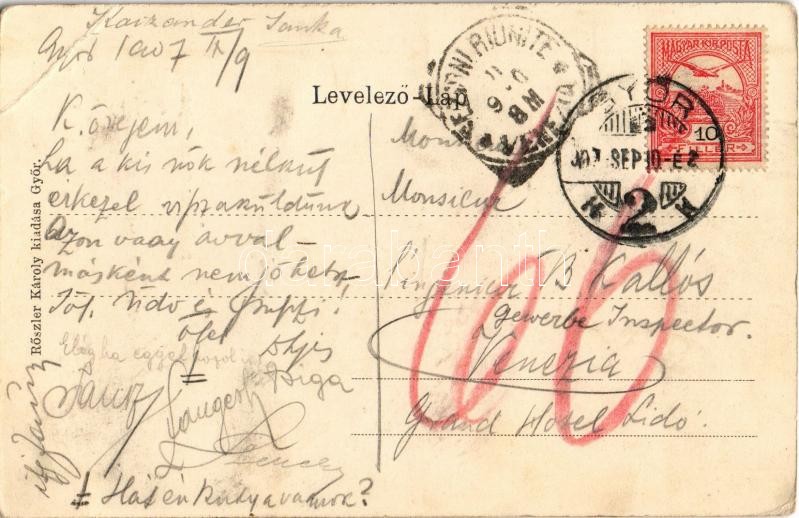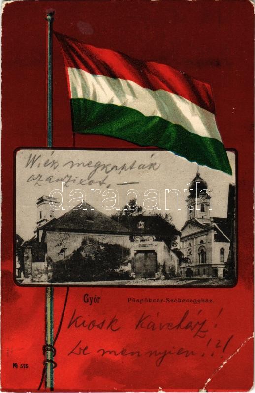 1907 Győr, Püspökvár székesegyház. Magyar zászlós litho keret, Art Nouveau. Rőszler Károly kiadása, Hátoldalon, Kallós Bertalan államtitkárnak, a Martinovics szabadkőműves páholy egykori nagymesterének címezve (EB)