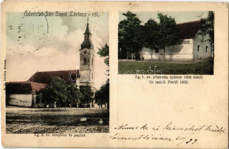 1907 Sárszentlőrinc, Evangélikus templom és paplak, Evangélikus altanoda épülete 1806-ból (itt tanult Petőfi Sándor 1833-ban). K. D. kiadása (vágott / cut)