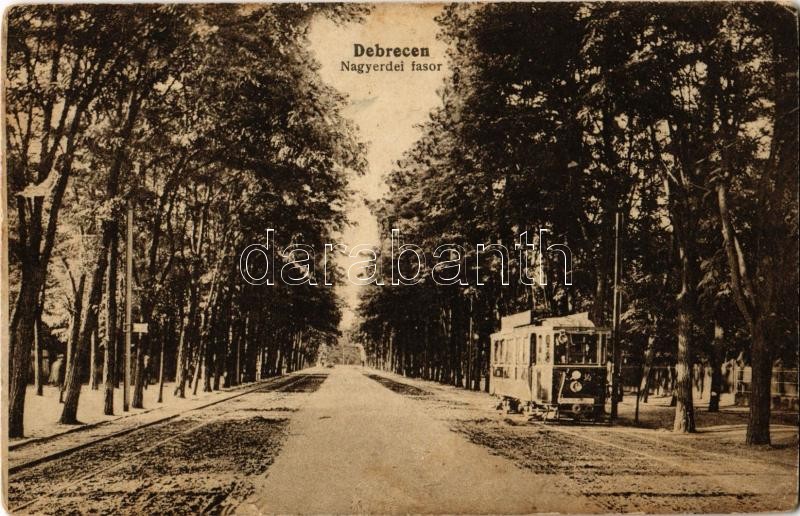 1917 Debrecen, Nagyerdei fasor, villamos. Vasúti Levelezőlapárusítás 6... https://www.darabanth.com/de/366-Fernauktion/366.0/Ansichtskarten/Ungarn~1500005/1917-Debrecen-Nagyerdei-fasor-villamos-Vasuti-Levelezolaparusitas-6964-kopott-sarkak-wor~II2118884