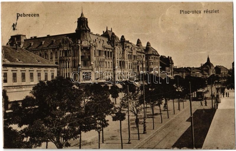 Beschreibung: 1917 Debrecen, Piac utca, villamos, Tóth, Kontsek Kornél üzlete. Vasúti Levelezőlapárusítás 6961.