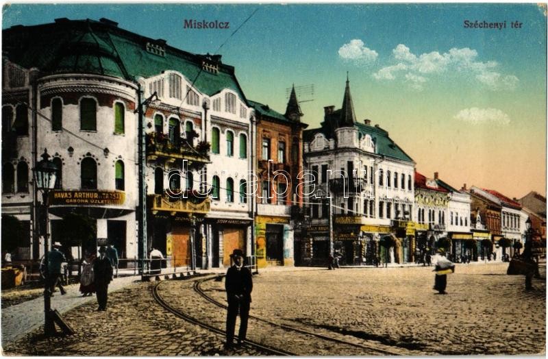 1917 Miskolc, Széchenyi tér, Havas Arthur és Társai gabona üzlete, Hungária biztosító, Király áruház, Dévényi testvérek kerékpáros, Stern és Handelsmann, Zeichner Adolf üzlete