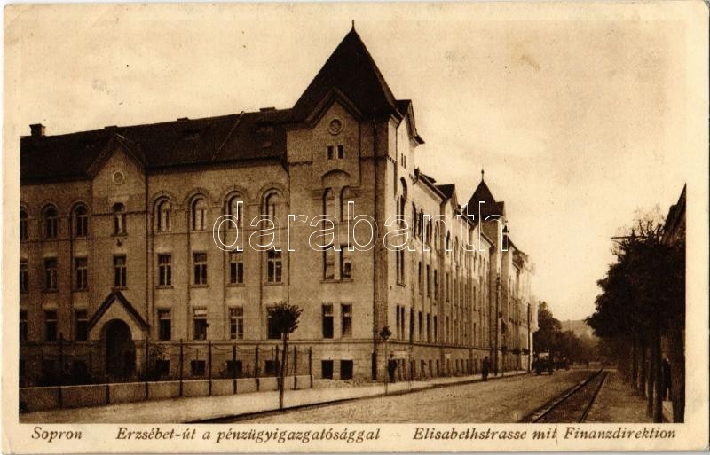1930 Sopron, Erzsébet út, Pénzügyigazgatóság, villamos pálya (EK) https://www.darabanth.com/de/366-Fernauktion/366.0/Ansichtskarten/Ungarn~1500005/1930-Sopron-Erzsebet-ut-Penzugyigazgatosag-villamos-palya-EK~II2122076