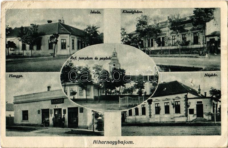 Beschreibung: 1935 Biharnagybajom, Iskola, Községháza, Népkör, Református templom és paplak, Hangya Szövetkezet üzlete és saját kiadása (EK)