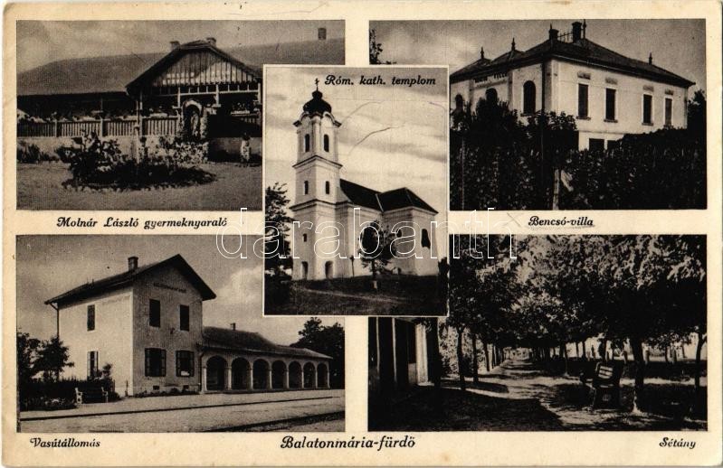 Beschreibung: 1936 Balatonmáriafürdő, Molnár László gyermeknyaraló, Római katolikus templom, Bencsó villa, Vasútállomás, sétány
